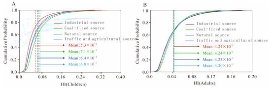 Non-carcinogenic probabilistic health risk assessment for each source ((A) for children, (B) for adults).