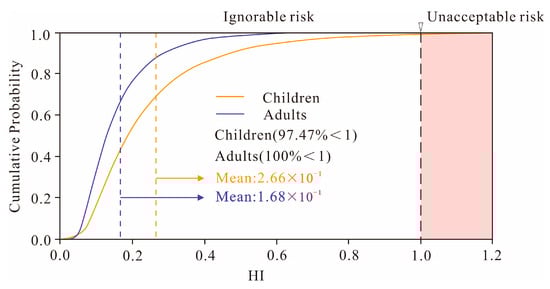 The probability distribution of the non-carcinogenic risk revealed a mean Hazard Index (HI) of 2.66 × 10−1 for children and 1.68 × 10−1 for adults. While the risk for adults remained below the threshold of 1 across all simulations, there was a 2.53% probability that the HI for children could exceed 1 (Figure 9). This indicates that certain locations pose a potential health threat to children, who are more vulnerable to exposure from multiple sources than adults. An effective strategy to mitigate this risk, particularly from toxic elements like arsenic (As), is to regulate children’s contact with soil []. Therefore, priority for soil management and risk control should be given to the northern part of the study area, which is subject to the dual influence of a high geological background (basalt distribution) and significant contributions from coal combustion sources.