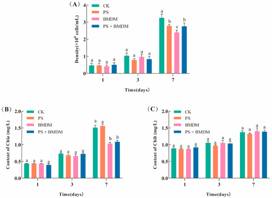 Effects of BMDM and PS on the growth and photosynthesis in Chlorella sp.: (A) cell density; (B) Chla content; (C) Chlb content. Note: CK: Solvent control (0.005% DMSO); PS: PS single exposure group (10 mg/L); BMDM: BMDM single exposure group (50 μg/L); BMDM + PS: Combined exposure group (50 μg/L BMDM + 10 mg/L PS). All measurements were performed in triplicate, and data are expressed as mean ± SEM. Significant differences between groups are indicated by different lowercase letters.