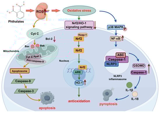 Drawing upon current research regarding the oxidative stress mechanisms associated with phthalates, we summarized three primary signaling pathways involved in oxidative stress, as illustrated in Figure 1: (1) Nrf2/HO-1 signaling pathway; (2) Bax/Caspase-3 signaling pathway; (3) Caspase/NLRP3 signaling pathway.