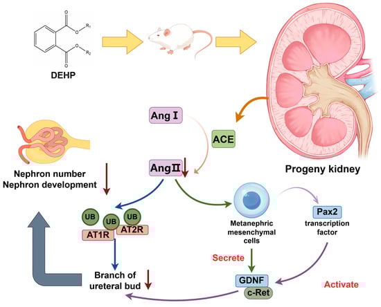 Lee et al. (2016) found that maternal DEHP exposure enhanced the expression of AT1R in offspring []. Conversely, DEHP reduced aldosterone levels by downregulating the ACE-AngII-AT1R pathway, which regulates sodium reabsorption and maintains sodium-potassium homeostasis. This pathway also contributes to renal inflammation and fibrosis [,,]. Furthermore, other study confirmed that maternal exposure to DEHP reduced renin and AngII expression levels in offspring []. The mechanistic pathways and effects are illustrated in Figure 2.