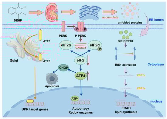 Recent scientific research revealed that DEHP could trigger the unfolded protein response (UPR) and ER stress, potentially adversely affecting protein metabolism in various organisms [].During ER stress, unfolded proteins cause dissociation of chaperones such as binding immunoglobulin protein (BIP) and glucose-regulating protein GRP78, leading to phosphorylation and dimerization of IRE1 and PERK, while ATF6 translocates from the ER membrane to the Golgi apparatus. These processes activate the ER-associated degradation (ERAD) pathway and reduce protein influx by suppressing translation efficiency [,]. Following DEHP exposure, cells exhibited a pronounced ER stress response, marked by a notable rise in the levels of GRP78 and GRP94 []. In this biological context, X-box binding protein 1 (XBP-1) played a crucial regulatory role, especially in orchestrating the UPR mechanisms []. Under stress conditions, unspliced XBP-1 (XBP-1u) is converted into its active spliced form (XBP-1s), which upregulates ER chaperone expression []. This process is summarized in Figure 3.