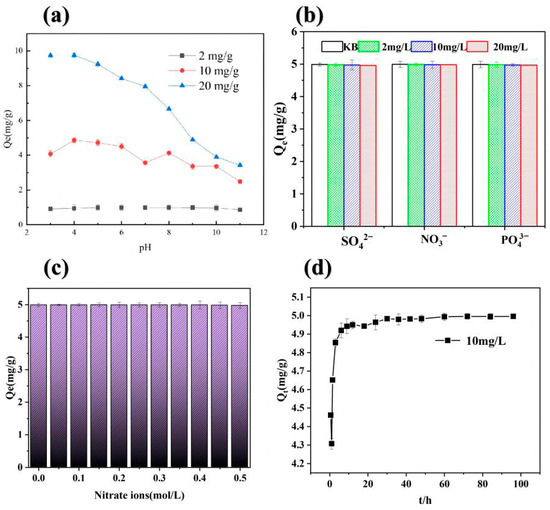 In addition to As(V) ions, different co-existing anions exist in wastewater that can compete for adsorption sites on the adsorbent surface, thereby affecting adsorption efficiency. We selected Na2SO4, NaNO3, and Na3PO4 as co-existing anions of SO42−, NO3−, and PO43−. We added 0.1 g of Fe-BC-500 to 50 mL of 10 mg/L As(V) solution at pH 4 and a temperature of 25 °C to study the effects of the selected anions on As(V) adsorption on Fe-BC-500. The experimental results are shown in Figure 2b. The Qe values of the KB, 2-, 10-, and 20 mg/L groups for SO42 ions were 4.992, 4.982, 4.973, and 4.961 mg/g, respectively. The Qe values of the KB, 2, 10, and 20 mg/L-groups for NO3− and PO43− ions were 4.993, 4.993, 4.982, and 4.981 mg/g, and 4.992, 4.983, 4.971, and 4.969 mg/g, respectively. As shown in Figure 2b, the effects of SO42−, NO3−, and PO43− on the adsorption of As(V) on Fe-BC-500 were non-significant. The addition of 2 mg/L NO3− to the solution had no effect on the adsorption of As(V) on Fe-BC-500. At NO3− concentrations of 10 mg/L, the adsorption of As(V) on Fe-BC-500 decreased by 0.01 mg/g (0.2%). For the 10 mg/L PO43− solution, the adsorption of As(V) on Fe-BC-500 in the KB group decreased by 0.02 mg/g (0.4%), a reduction twice as high as that induced by NO3− ions. Although PO43− and As(V) compete for adsorption sites, the ability of As(V) to bind to iron oxides is stronger than that of PO43− ions. The impact of different concentrations of SO42−, NO3−, and PO43− on the adsorption of As(V) varied in the order PO43− > SO42− > NO3−, which is consistent with the results of Islam et al. [63].