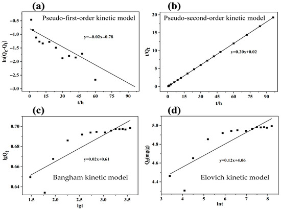 (a) Pseudo-first-order kinetic model; (b) Pseudo-second-order kinetic model; (c) Bangham kinetic model; (d) Elovich kinetic model.