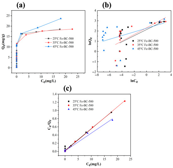 We added 0.1 g of Fe-BC-500 to 50 mL of As(V) solution with different concentrations (0.5, 1, 2, 4, 6, 8, 10, 12, 15, 20, 30, 40, 50 mg/L), and conducted adsorption experiments at 25, 35, and 45 °C and pH 4. The adsorption isotherms are shown in Figure 4a. At 25 °C, the adsorption capacity of the unmodified biochar (M-BC-500) for As(V) was approximately 3.00 mg/g, while that of Fe-BC-500 was 18.5 mg/g, representing an increase of approximately 84%. As the reaction temperature increased from 25 to 45 °C, the adsorption capacity of Fe-BC-500 increased from 18.51 to 23.6 mg/g, indicating a positive correlation between the adsorption capacity of Fe-BC-500 for As(V) and temperature. This points toward an endothermic reaction. Increased temperatures enhance activation of the adsorbent and accelerate chemical adsorption between adsorbent and adsorbate [66]. Baig et al. [67] used magnetic biochar (MKGB3 and MKGB4) prepared using KGS to sorb As(V) from a solution, with an optimal adsorption capacity of 3.1 mg/g. Ahmad et al. [68] significantly improved the As adsorption performance of cotton stem biochar (CSB) for As through chemical modifications. The CSB modified with nitric acid exhibited the best As adsorption capacity owing to its high specific surface area, developed pore structure, and increased number of surface functional groups. The maximum adsorption capacity of that CSB was 157 µg·g−1 (Langmuir model), and the removal rate of As under experimental conditions ranged between 67 and 95%. Benis et al. [69] successfully improved the As(V) adsorption performance of rapeseed straw biomass and biochar in water via electrochemical modification. The maximum adsorption capacities of rapeseed straw biomass and biochar after modification increased to 766 and 922 µg·g−1, respectively. Compared with these modified biochar adsorbents, Fe-BC-500 has a higher adsorption capacity for As(V) and certain environmental remediation advantages.