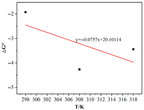 According to adsorption isotherm analysis, the Langmuir equation more consistently described the adsorption process of As(V) on Fe-BC-500. We thus substituted the Langmuir equation constant KL for the adsorption of As(V) on Fe-BC-500 at different adsorption temperatures into the adsorption thermodynamic equation and calculated the Gibbs free energy △G by combining the Van’t Hoff equation with the Gibbs Helmholtz equation. We then linearly regressed △G against T. The slope −△S and intercept △H are shown in Figure 5. The relevant parameters are listed in Table 3.