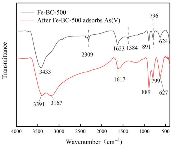 Figure 6 shows infrared spectra of Fe-BC-500 before and after adsorption of As(V). The broad peak at wave number 3433 cm−1 is the stretching vibration peak of hydroxyl (OH), which split into dual peaks of 3391 and 3167 cm−1 after adsorption. Moreover, the peak shape changed, indicating that hydroxyl participates in adsorption and undergoes ligand exchange, hydrogen bonding formation, or coordination reactions, leading to a change in the O-H vibration mode. The 2309 cm−1 peak is characteristic of background CO2. The 1623 cm−1 peak is the stretching vibration peak of carbonyl C=O and unsaturated alkyl C=C, which shifted to 1617 cm−1 after adsorption, indicating interaction between C=O or C=C and As(V). That is, either the lone pair of electrons on the oxygen atom of carbonyl C=O or the delocalized electrons in conjugated large π-bonds coordinated with As. The peaks at 891, 796, and 624 cm−1 are the anti-symmetric and symmetric stretching vibration peaks of Fe-O. After adsorption, the peak positions exhibited a small blue shift and intensity change. At the same time, peaks matching the As-O vibration appeared at 889 and 799 cm−1, indicating the formation of AsO43−. The Fe sites coordinated with As(V) to form Fe–As bonds. We thus infer that the adsorption of As(V) on Fe-BC-500 involves multiple synergistic mechanisms. The hydroxyl groups on the surface of the biochar or iron-based sites underwent ligand exchange with the oxygen-containing acid groups H2AsO4− and HAsO42−, and −OH was replaced by AsO43−, further enhancing the Fe-As coordination effect. This is consistent with the splitting and deformation of the hydroxyl region peak. In aqueous solutions, As(V) mainly exists in the form of anions. The Fe-BC-500 surface, especially the Fe-based oxide sites, is positively charged at a suitable pH and adsorbs anionic As(V) through electrostatic attraction, providing an initial driving force for coordination complexation [70]. The FTIR results further showed a significant change in peak shapes before and after adsorption, which is consistent with the results of Zhao et al. [71], indicating that As can be adsorbed on the surface of Fe-BC-500 through ion exchange. The shift in peak positions not only confirms the existence of Fe-O-As internal coordination but also indicates the substitution between surface carboxyl groups and active sites when As(V) exists as anions, leading to changes in the vibration mode.