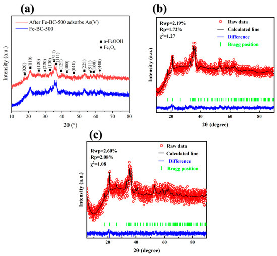 (a) X-ray diffraction spectra of Fe-BC-500 before and after As(V) adsorption; (b) X-ray diffraction refinement spectrum of Fe-BC-500 before As(V) adsorption; (c) X-ray diffraction refinement spectrum of Fe-BC-500 after As(V) adsorption.