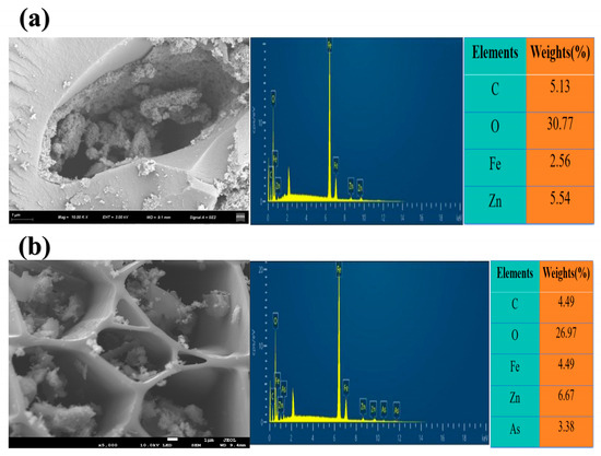 As shown in Figure 8, Fe-BC-500 exhibited a porous and loose microstructure before adsorption of As(V), with an uneven distribution of voids and obvious void and particle accumulation on the surface. This porous structure provides physical adsorption sites for the adsorption of As(V). Compared with those before adsorption, the pores of Fe-BC-500 after adsorption of As(V) were filled, surface particle accumulation was denser, and the “porosity” of some pores was reduced. This is because As(V) ions were adsorbed by the material and adhered to the pore surface or filled the pores, resulting in “densification” of the microstructure. These patterns are similar to those found by Zhang et al. [72], who observed the appearance of many granular sediments and an increasingly uneven surface bulge distribution of iron-biochar upon combination with other substances. This phenomenon demonstrates the adsorption effect of As(V) on the materials. As(V) adheres to the surfaces of materials through physical and chemical interactions, changing the original porous structure. The main elements on the surface of the samples were analyzed using Scanning Electron Microscope-Energy Dispersive Spectroscopy, as shown in Figure 8a,b. The results showed that a large amount of substances was loaded onto the surface and pores of Fe-BC-500 before and after adsorption of As(V). The corresponding energy spectrum showed that Fe-BC-500 contained C, O, Zn, and Fe (in the order Fe > O > C) before adsorption of As(V), indicating the presence of Fe on its surface. The presence of Zn was due to the addition of ZnCl solution during modification. After adsorption of As(V), Fe-BC-500 contained C, O, Fe, Zn, and As. Comparison of the SEM images after adsorption of As(V) indicated that the original rough structure on the surface of Fe-BC-500 was covered by new and dispersed granular materials. EDS surface-scanning elemental analysis indicated strong As signals in these new material regions, whose spatial distribution was highly consistent with the Fe signal. This result directly confirms that As(V) was effectively adsorbed and enriched on the iron oxide sites and within the pores on the Fe-BC-500 surface.