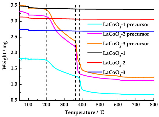 Thermogravimetric (TG, PerkinElmer, TGA4000, Waltham, MA, USA) analysis was performed on lanthanum cobalt oxides and their precursors. Samples were tested under an atmosphere with a flow rate of 20 mL/min. The temperature range was 50–800 °C, with a heating rate of 10 °C/min. The sample was stabilized at 100 °C for 5 min during the heating process.
