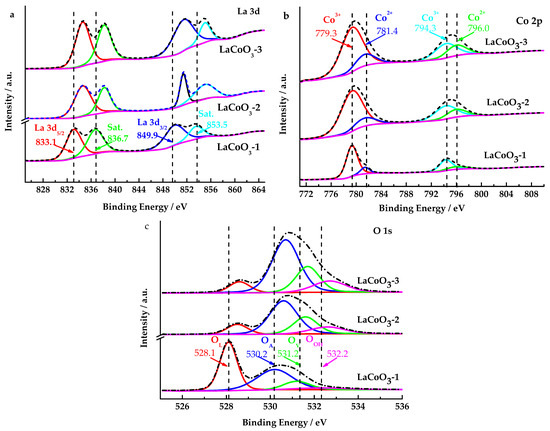 Figure 4a shows the La 3d spectra of LaCoO3-1, LaCoO3-2 and LaCoO3-3, which all contained four peaks. The La3d XPS spectrum of LaCoO3-1 reveals a binding energy of 849.9 eV for La 3d3/2 and 833.1 eV for La 3d5/2, with satellite peaks appearing at 853.5 eV and 836.7 eV. The La 3d splitting energy is about 16.8 eV, close to the splitting energy of pure La2O3, indicating that the oxidation state of lanthanum element species in LaCoO3-1 is primarily +3 [42,43]. Since LaCoO3-2 and LaCoO3-3 have increased the La2O3 content, the electron binding energy of La 3d in LaCoO3-2 and LaCoO3-3 has increased.