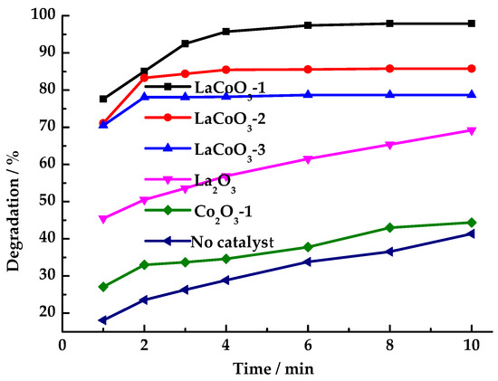 Perovskite catalysts have been extensively studied in the catalytic treatment of wastewater and have been shown to have good degradation effects [34,35,36]. The chemical general formula of perovskite-type oxides is ABO3. Lanthanide-based perovskite has been reported to be a good candidate for heterogeneous catalysis. In addition, Co is the most effective transition metal for homogeneous catalysis, so heterogeneous Co-based catalysts exhibiting low Co2+ leaching rates have attracted the attention of researchers. Therefore, it is necessary to introduce Co into the B site of perovskite catalysts to prepare stable cobalt-containing perovskite-type catalysts [37].