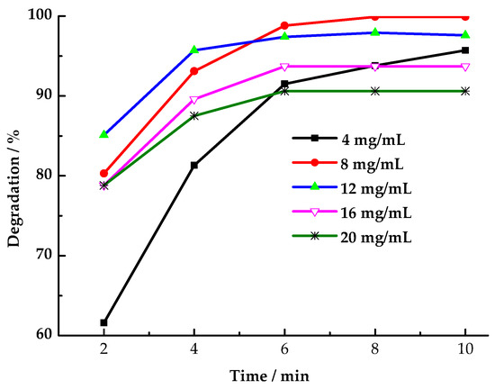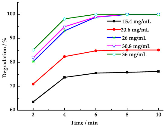 Figure 6. Effect of LaCoO3-1 dosage on degradation rate of HCHO (Reaction conditions: HCHO solution 1.086 mg/mL, PMS 26 mg/mL, 25 °C).