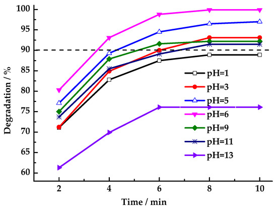 The acidity or alkalinity of HCHO wastewater is uncertain, and the pH value of the solution will affect the removal efficiency of pollutants. Thus, the catalytic oxidation system must perform effectively across a broad pH range. As shown in Figure 9, the performance of LaCoO3-1 in activating PMS for HCHO degradation was investigated across a range of solutions with different pH values. Results indicate that under near-neutral conditions (pH = 3–11), HCHO degradation rates exceeded 90% within 10 min, with neutral conditions yielding the highest degradation rate. As acidity or alkalinity increased, the HCHO degradation rate decreased. The presence of strong acids and bases in the reaction medium was found to be deleterious to the degradation process. Under alkaline conditions, the degradation rate declined because SO4· reacted with OH to form hydroxyl radicals (·OH), which have a relatively short lifetime in the solution system. Under acidic conditions, pH changes may cause varying amounts of lanthanum or cobalt ions to leach into the solution, disrupting the catalyst structure. Overall, LaCoO3-1-catalyzed PMS degradation of HCHO exhibits a broad pH tolerance range.