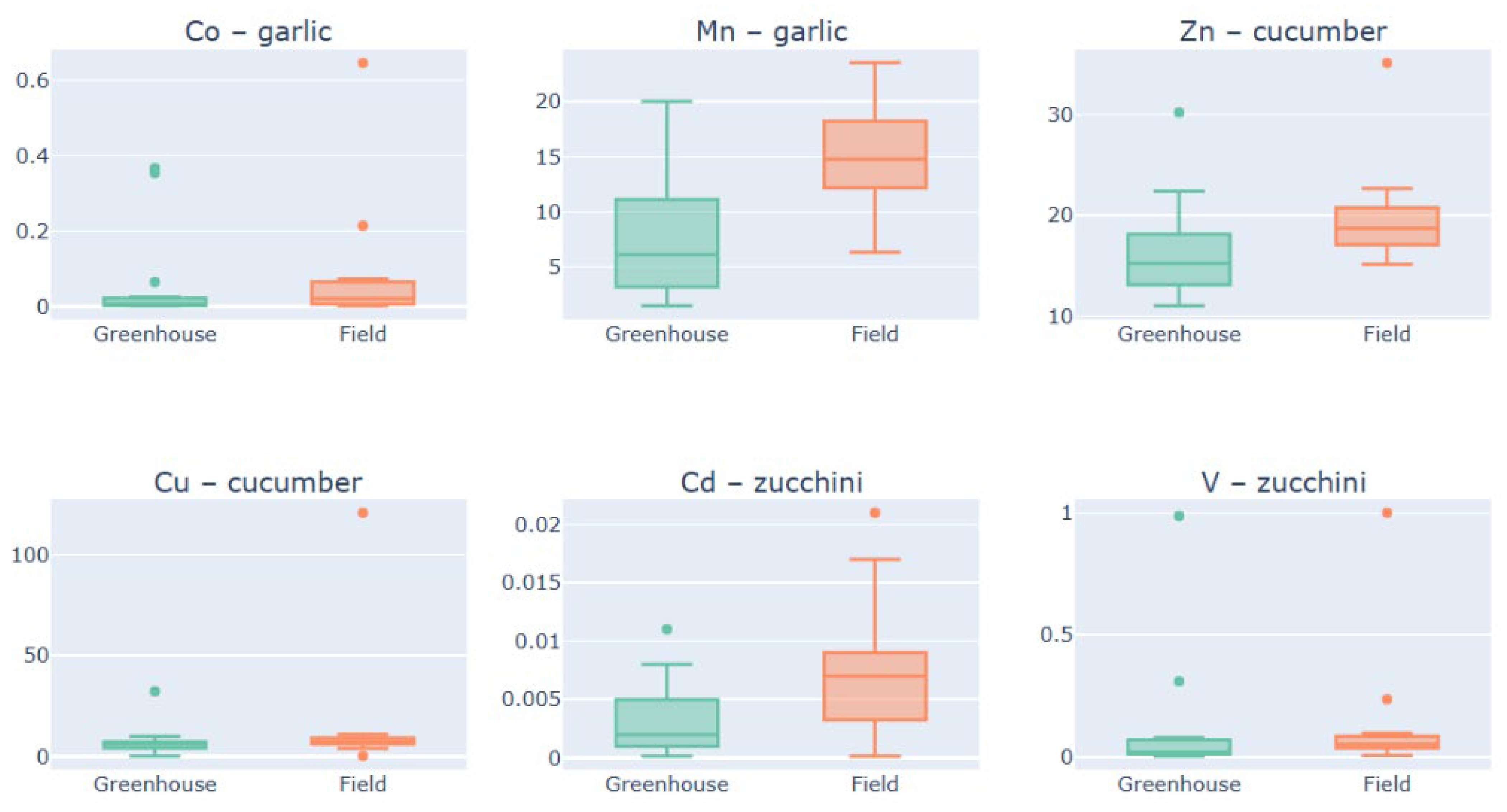 | Co | 0.070–1.11 | 0.010–0.98 | Low accumulation, some enrichment in field zucchini |