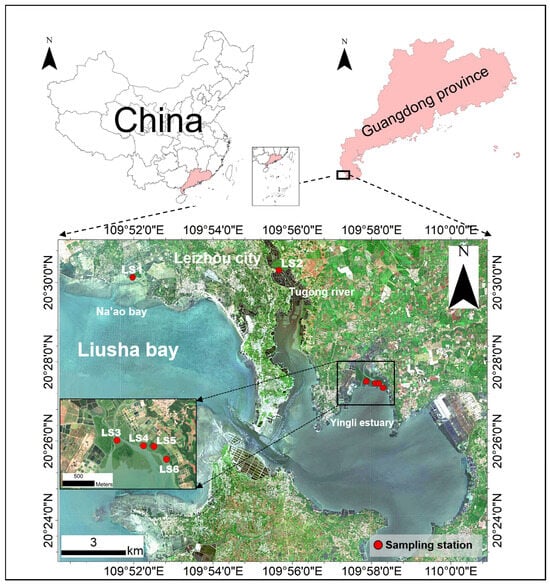 Liusha Bay, located in southwestern Leizhou Peninsula, China, is a renowned marine pearl cultivation and production base, whose annual output accounts for ~70% of China’s total marine pearl production [8,9]. It harbors the largest seagrass beds in southern China’s coastal areas, along with mangroves and coral reefs, possessing high marine ecological research value [10]. Current studies on Liusha Bay mainly focus on seagrass bed distribution and ecological value [11], annual variations in epiphytes and their impacts on seagrass physiology [12], heavy metal enrichment and ecological risks in seagrass beds [13], marine environmental quality assessment [14], mangrove–seagrass bed ecological connectivity and carbon storage [10], heavy metal pollution of Sardinella albella [9], and bacterial communities on pearl culture facilities [8]. Liusha Bay’s mangroves belong to Zhanjiang National Mangrove Nature Reserve, China’s largest mangrove reserve [15]. In recent years, with the expansion of mariculture and increased maritime shipping/operations in Liusha Bay, the sea area faces ecological threats from heavy metals and other pollutants [13,14]. However, studies on the geochemical characteristics and heavy metal pollution of mangrove sediments in Liusha Bay remain unreported.