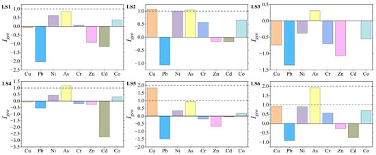 The average Igeo values of the eight heavy metals ranged from −1.23 to 1.04, and the accumulation degree sorted by average values was in the order of As > Cu > Ni > Co > Cr > Zn > Cd > Pb. There were significant differences in Igeo values among different stations: Station LS1 had the highest Igeo values for As and Co; Station LS3 had the highest Igeo values for Ni and Cr; Station LS6 had the highest Igeo value for Cu. In contrast, Station LS4 had relatively low Igeo values for all eight heavy metals, while Stations LS1 and LS3 generally had relatively high Igeo values for all heavy metals.