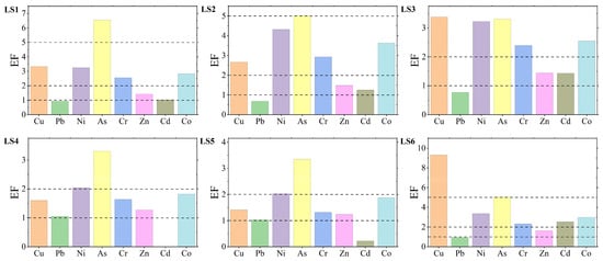 In terms of comparison among different stations, Station LS1 had the highest EF value for As, corresponding to the “moderately/heavily” pollution level; Station LS2 had the highest EF values for Ni, Cr, and Co, all of which corresponded to the “moderately” pollution level; Station LS4 had the highest EF value for Pb, corresponding to the “slightly” pollution level; and Station LS6 had the highest EF values for Cu, Zn, and Cd, corresponding to the “moderately/heavily”, “slightly”, and “moderately” levels, respectively.