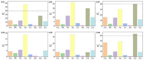 In terms of comparison among different stations, Station LS1 had the highest values for Ni, As, and Co, among which As was at the moderate ecological risk level, while Ni and Co were both at the low level; Station LS3 had the highest values for Cr and Zn, and both were at the low ecological risk level; Station LS5 had the highest value for Pb, which was at the low ecological risk level; Station LS6 had the highest values for Cu and Cd, among which Cd was at the moderate ecological risk level, and Cu was at the low level.