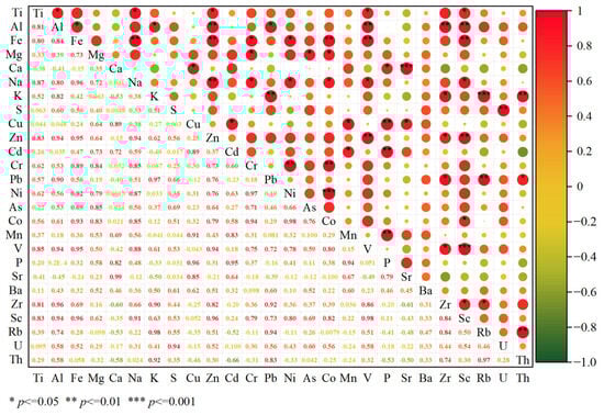 Analysis results of the concentrations of eight major elements in mangrove sediments from Liusha Bay (Table 2, Figure A1) showed the following: the concentrations of Al and Fe were significantly higher, with Al slightly higher than Fe, and the average concentrations of both exceeded 5% (mass fraction); the concentration of Ca was also relatively high, with an average value close to 2%; the average concentrations of the remaining five major elements all ranged from 0.5% to 1%, sorted in descending order of concentration as Na > S > Mg > Ti > K.