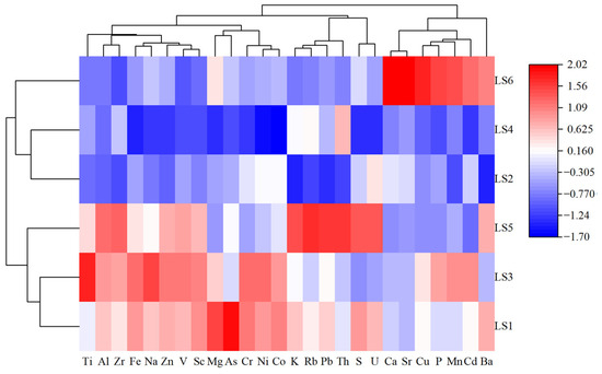 In terms of differences among stations: the concentrations of Zn, Pb, V, Zr, and Sc in Stations LS1, LS3, and LS5 were relatively higher, and the concentrations of Cr, Ni, and Co in Stations LS1 and LS3 were also at relatively high levels. The stations with the highest concentrations of each element were as follows: Station LS1 had the highest concentrations of As and Co; Station LS3 had the highest concentrations of Zn, Cr, Ni, V, and Sc; Station LS5 had the highest concentrations of Pb, Zr, Rb, and U. The concentrations of Cu, Zn, As, Mn, P, and Ba in Stations LS2 and LS4 were relatively lower. Among these, Station LS2 had the lowest concentrations of Pb, Mn, Ba, Zr, Rb, and Th; Station LS4 had the lowest concentrations of Cu, Zn, Cd, Cr, Ni, As, Co, V, P, Sr, Sc, and U. The special station LS6 (the mudflat) had the highest concentrations of Cu, Cd, Mn, P, Sr, and Ba among all stations.