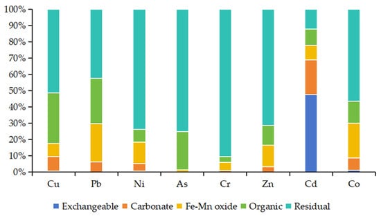 Element contents in sediments were measured by inductively coupled plasma mass spectrometry (ICP-MS) using Agilent 5110 and Agilent 7900 instruments (Agilent Technologies Inc., Santa Clara, CA, USA). The test adopted the simplified ISO 11466 method [20], with method errors within 10%, meeting analytical requirements. A blank sample, repeated sample, and certified reference material (GBM321-8; This standard substance is sourced from Geostats Pty Ltd., O’Connor, Australia) were inserted during the laboratory test to ensure data. Heavy metal speciation was analyzed via the Tessier five-step sequential extraction method to determine exchangeable, carbonate-bound, Fe-Mn oxide-bound, organic matter-bound, and residual fractions. All analyses were conducted by the ALS Laboratory in Guangzhou.