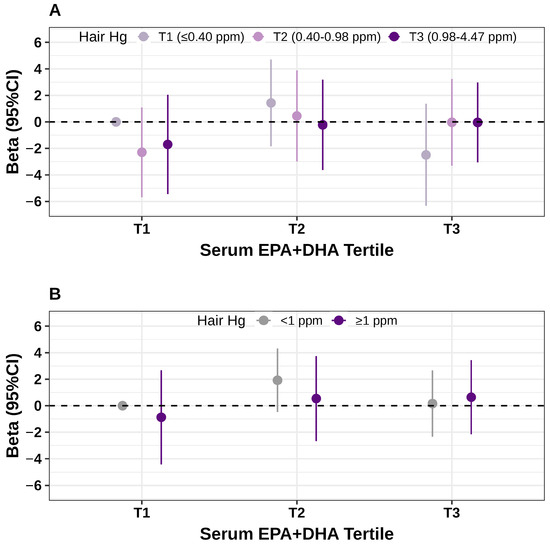 The potential effect modification by n-3 LC-PUFA has been largely overlooked in most studies examining the relationship between Hg exposure and body weight [12,13,16,17]. Among those that did account for n-3 LC-PUFA [14,15], intake was typically assessed using self-reported methods such as 24-hour dietary recalls, which are prone to both random and systematic measurement errors [31]. In this context, serum biomarkers provide an objective measure of EPA + DHA intake from various dietary sources, thereby enabling a more accurate investigation of their potential role in the association of Hg exposure and GWG. Although not statistically significant, likely due to the limited sample size, we observed a suggestive inverse association between hair Hg concentrations and GWG among participants in the lowest tertile of serum EPA + DHA, but not among those in the middle or highest tertile. This pattern suggests that the directions of association between Hg and n-3 LC-PUFA with GWG may differ, with the association between Hg and GWG potentially attenuated in the presence of high n-3 LC-PUFA. This observation supports current FDA recommendations for fish intake during pregnancy, which emphasize choosing fish that are low in MeHg and rich in healthy n-3 fats [32]. However, it should be noted that the effect of n-3 LC-PUFA on GWG remains unclear, as current evidence is limited, although a positive association direction has been observed in several intervention studies [33].