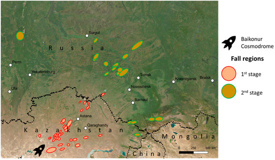 Falling zones of the rocket stages launched from the Baikonur Cosmodrome.