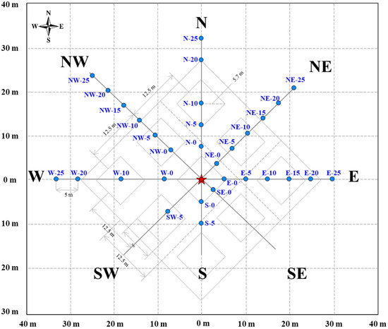 Scheme of the sampling grid map: blue dots indicate sampling points, capital letters denote directions, and the numeric label at each dot represents the radial distance (m) from the epicenter.