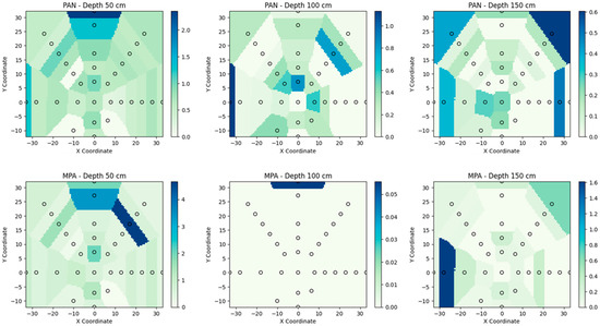 Mapping of concentrations of PAN and MPA in soil samples at depths of 50 cm, 100 cm, and 150 cm.