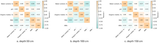 Heatmaps of pairwise Pearson correlations between soil physicochemical parameters and concentrations of PAN and MPA by depth: (a) 50 cm; (b) 100 cm; (c) 150 cm.