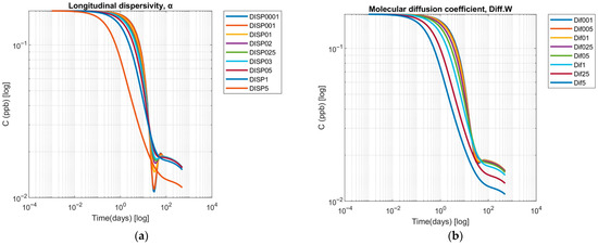 Sensitivity analysis of (a) the longitudinal dispersivity, and (b) the molecular diffusion coefficient.