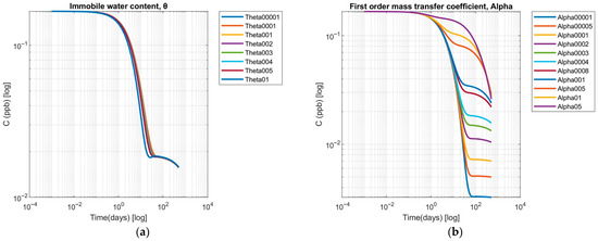 These findings demonstrate a non-linear threshold response: θ ≤ 0.001 had a negligible effect, θ around 0.01 introduced significant long-term tailing, and θ ≥ 0.03 produced both accelerated early depletion and enhanced long-term persistence. This behavior reflects diffusion-limited exchange between mobile and immobile regions, consistent with dual-porosity transport theory [42,59].