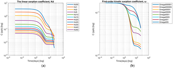 Finally, sensitivity analysis for soil chemical interaction parameters included variations for the linear sorption coefficient (Kd) and the first-order kinetic sorption coefficient (ω). The time-concentration profiles simulated for a solute under Kd ranging from 0.5 to 50 cm3 kg−1 reveal distinct sorption-dependent attenuation patterns (Figure 8a). During the earliest phase (10−3–10−2 days), all scenarios show nearly identical concentrations (~3.5 ppb for Kd = 0.5 cm3 kg−1) with minimal decline as Kd increases, indicating that sorption processes remain negligible when advection-dispersion dominates transport. A noticeable separation between concentration curves emerges between 0.1 and 1 day, reflecting progressively stronger retardation with increasing Kd. For intermediate adsorption coefficients (5–15 cm3 kg−1), attenuation is more pronounced, and concentrations fall below 0.1 ppb within 30 to 60 days, a behavior representative of sandy and loamy soils with low-to-moderate organic carbon content. At high sorption strengths (Kd ≥ 20 cm3 kg−1), concentrations exhibit strong initial retardation and eventually stabilize around 0.01 ppb by 200–250 days, reflecting slower but more persistent release compared to intermediate Kd values (5–15 cm3 kg−1), which decline below 0.1 ppb within 30–60 days. Such behavior suggests strong immobilization typical of soils enriched in clay minerals or organic matter.