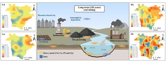 - Xiong, H.; Yin, Y.; Cui, X.; Dai, W.; Dong, J.; Wang, X.; Duan, G. The Effects of Coal Mining on Heavy Metal Concentration and Microbial Composition in Surrounding Soils. J. Environ. Sci. 2025; in press. [Google Scholar] [CrossRef]