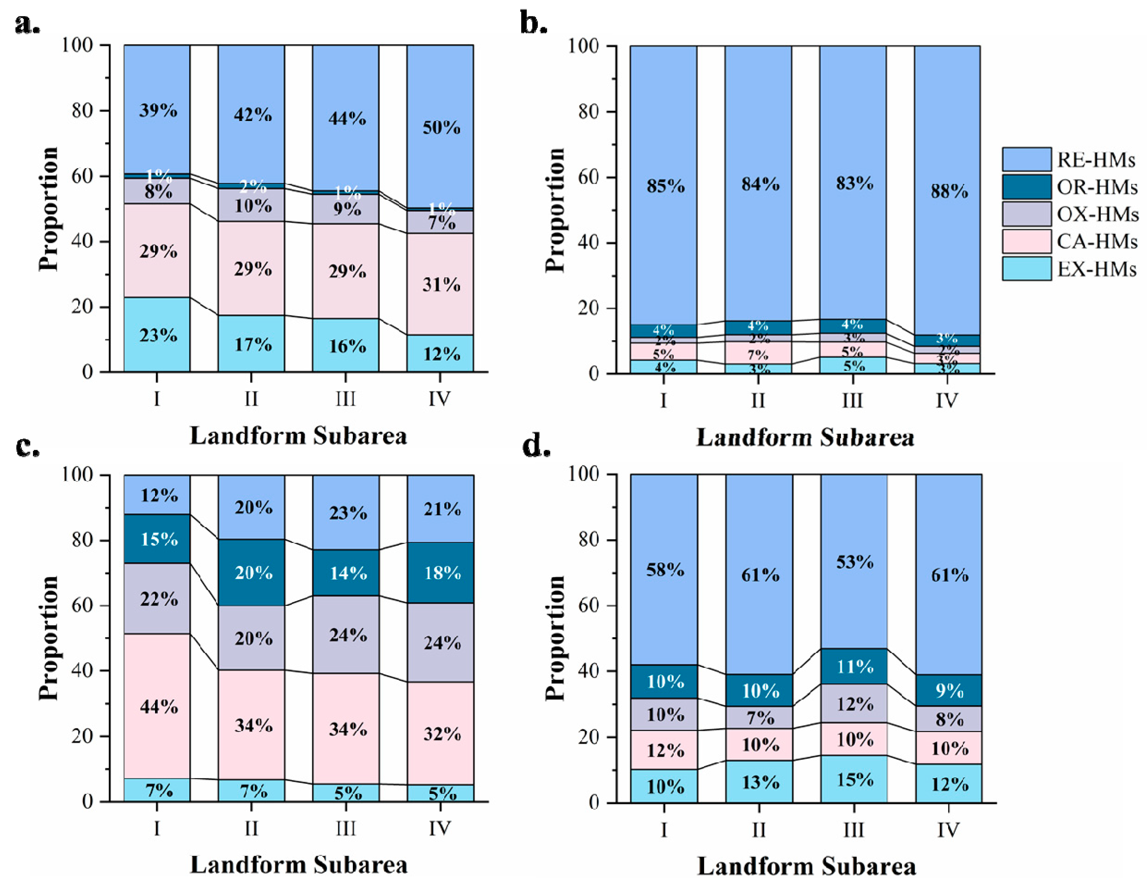 3.2. Distribution Characteristics of HM Speciation Based on Landform