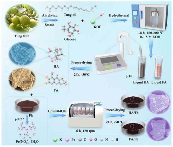 Schematic diagram for the preparation of HA/Fh and FA/Fh adsorbents.
