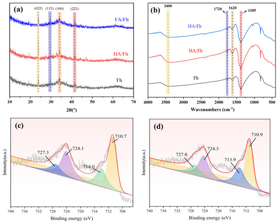 (a) XRD pattern, (b) FTIR spectra of Fh, HA/Fh and FA/Fh; XPS spectrum of Fe2p, (c) Fh, (d) FA/Fh.