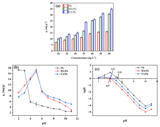 (a) Adsorption capacity of phosphate by HA/Fh and FA/Fh adsorbents, (b) the effect of pH on the adsorption capacity, (c) the point of zero charge (pHzpc) of the adsorbents.
