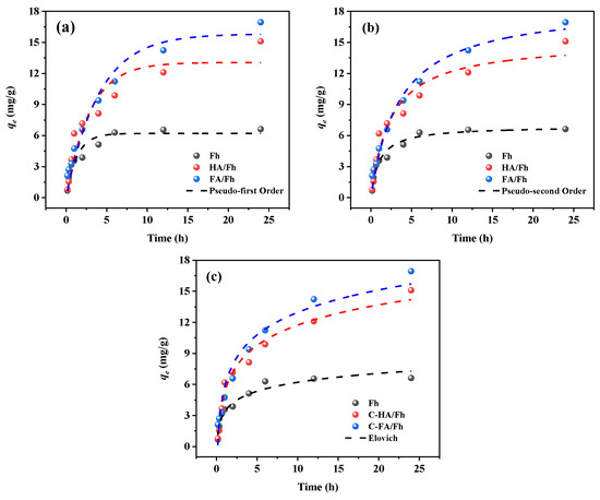 Adsorption kinetics by HA/Fh and FA/Fh adsorbents: (a) pseudo-first-order kinetic models, (b) pseudo-second-order kinetic models, (c) Elovich models.