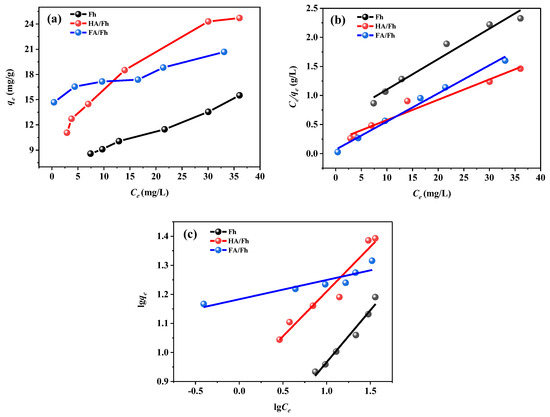 Adsorption thermodynamics of HA/Fh and FA/Fh of adsorbents: (a) adsorption isothermal curve, (b) Langmuir model, (c) Freundlich model.