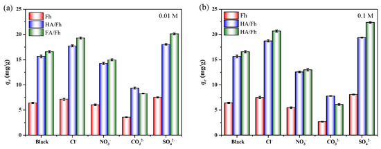 Effect of coexisting ions on phosphate adsorption performance: (a) 0.01 M, (b) 0.1 M.