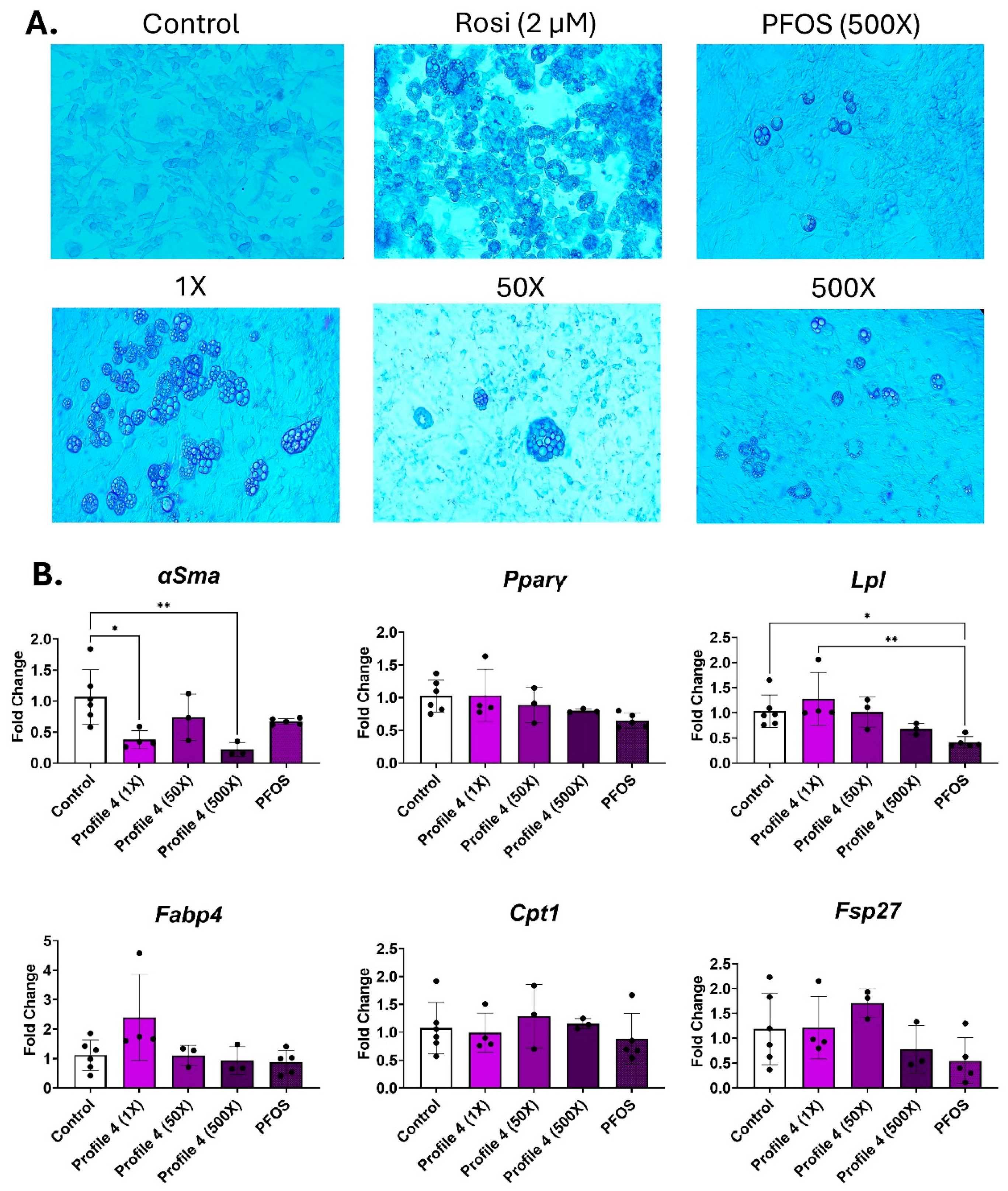 Figure 3. Profile 4 and PFOS exposure decreases Lpl expression and increases lipid accumulation. 3T3-L1 cells were exposed to DMSO (control), Rosi (2 µM), Profile 4 (1×, 50×, and 500×), or single chemical PFOS (500×) for 14 days. (A) On day 14, morphological changes of 3T3-L1 cells were evaluated at 100X magnification and representative brightfield images are presented above. (B) Transcript levels of αSma (fibroblast marker), Pparγ (transcription factor), Lpl (extracellular enzyme), Fabp4 (fatty acid-binding protein), Cpt1 (mitochondrial transporter), and Fsp27 (lipid droplet associated protein) were also measured on day 14. β2-microglobulin (β2mg) and TATA binding protein (Tbp) were used as housekeeping genes to normalize the data. The ΔΔCT method was used to analyze gene expression (n = 3–6 replicates per concentration per exposure group). Statistical differences were determined by a one-way ANOVA followed by Tukey’s multiple comparisons test (* for p ≤ 0.05; ** for p ≤ 0.01).