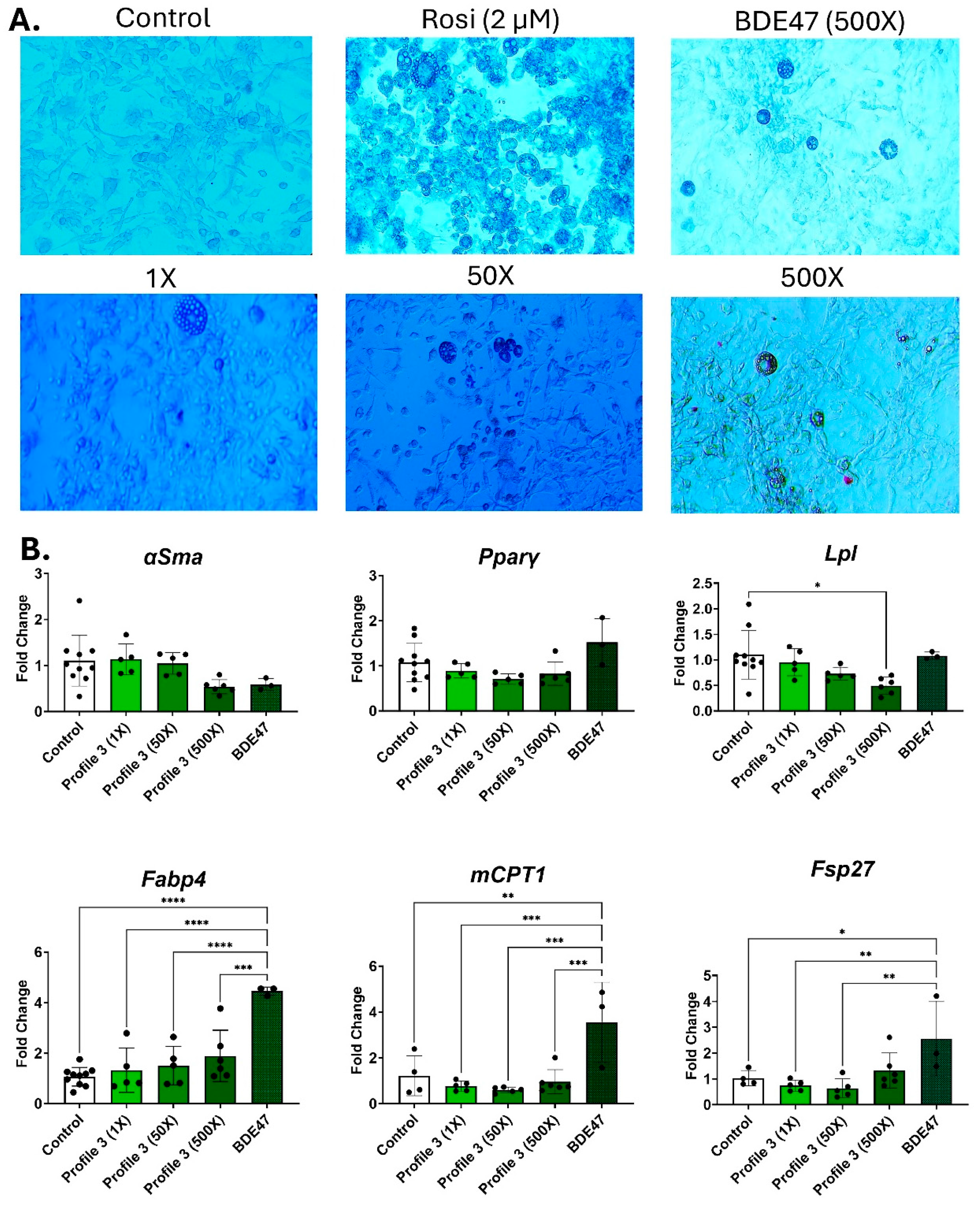 Figure 4. BDE47 exposure decreases Lpl, Fabp4, and Cpt1 expression, but causes no change to lipid accumulation. 3T3-L1 cells were exposed to DMSO (control), Rosi (2 µM), Profile 3 (1×, 50×, and 500×), or single chemical BDE47 (500×) for 14 days. (A) On day 14, morphological changes of 3T3-L1 cells were evaluated at 100X magnification and representative brightfield images are presented above. (B) Transcript levels of αSma (fibroblast marker), Pparγ (transcription factor), Lpl (extracellular enzyme), Fabp4 (fatty acid-binding protein), Cpt1 (mitochondrial transporter), and Fsp27 (lipid droplet associated protein) were also measured on day 14. β2-microglobulin (β2mg) and TATA binding protein (Tbp) were used as housekeeping genes to normalize the data. The ΔΔCT method was used to analyze gene expression (n = 3–6 replicates per concentration per exposure group). Statistical differences were determined by a one-way ANOVA followed by Tukey’s multiple comparisons test (* for p ≤ 0.05; ** for p ≤ 0.01; *** for p ≤ 0.001; **** for p ≤ 0.0001).