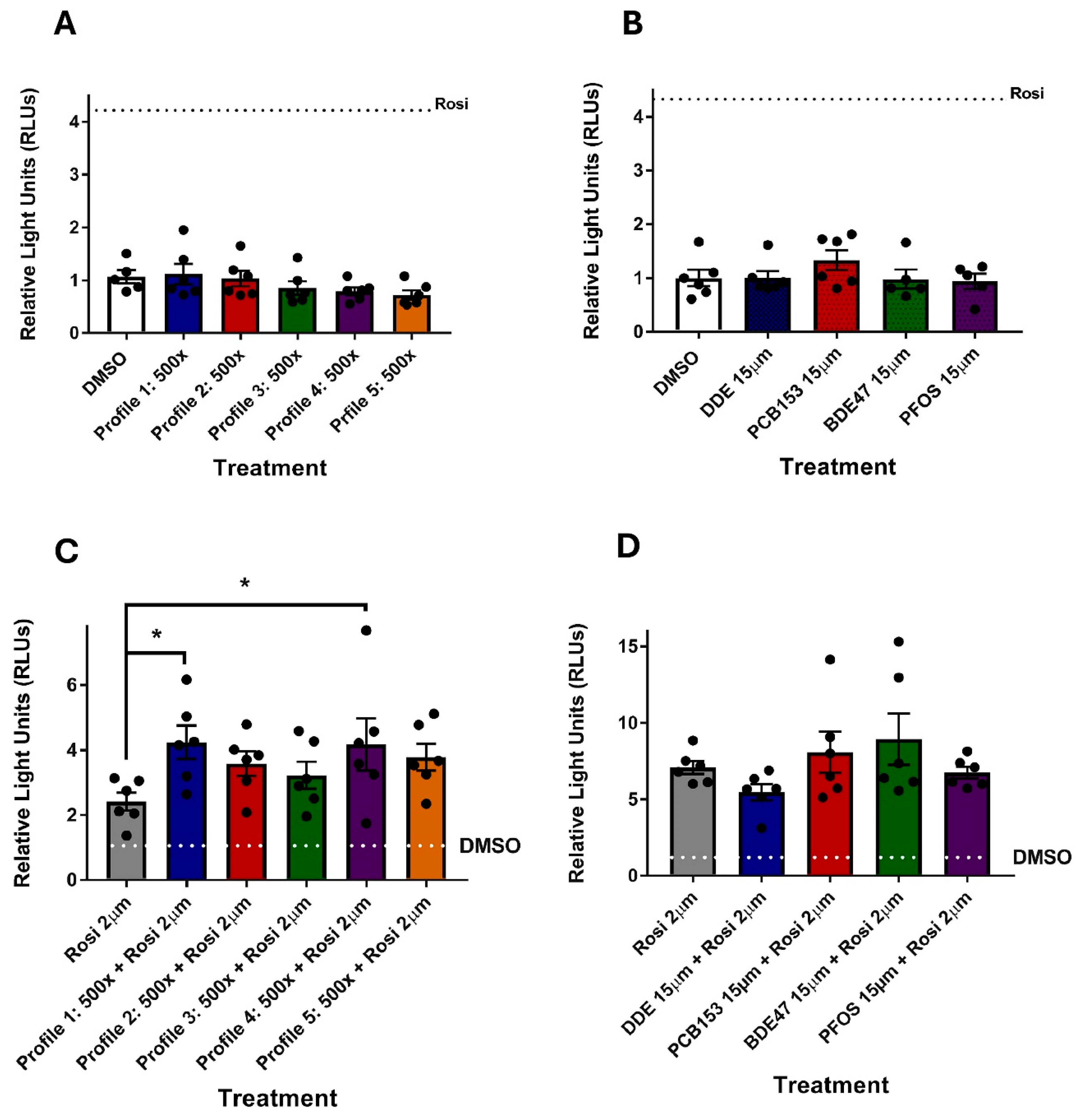 Figure 6. Exposure to profile mixtures at 500× and individual chemicals at 15 μM does not activate PPARγ. PPARγ transactivation assays were performed using rosiglitazone (Rosi) as the positive control. (A) Profiles 1–5 (500×) and (B) individual chemicals at 15 μM were assessed for PPARγ transactivation activity. To assess antagonistic effects, (C) rosiglitazone (2 μM) was co-incubated with Profiles 1–5 (500×) and (D) individual chemicals at 15 μM. Each sample was then assessed for PPARγ transactivation activity. Statistical differences (*) were determined by a one-way ANOVA followed by Fisher’s LSD test (p ≤ 0.05; n = 6).