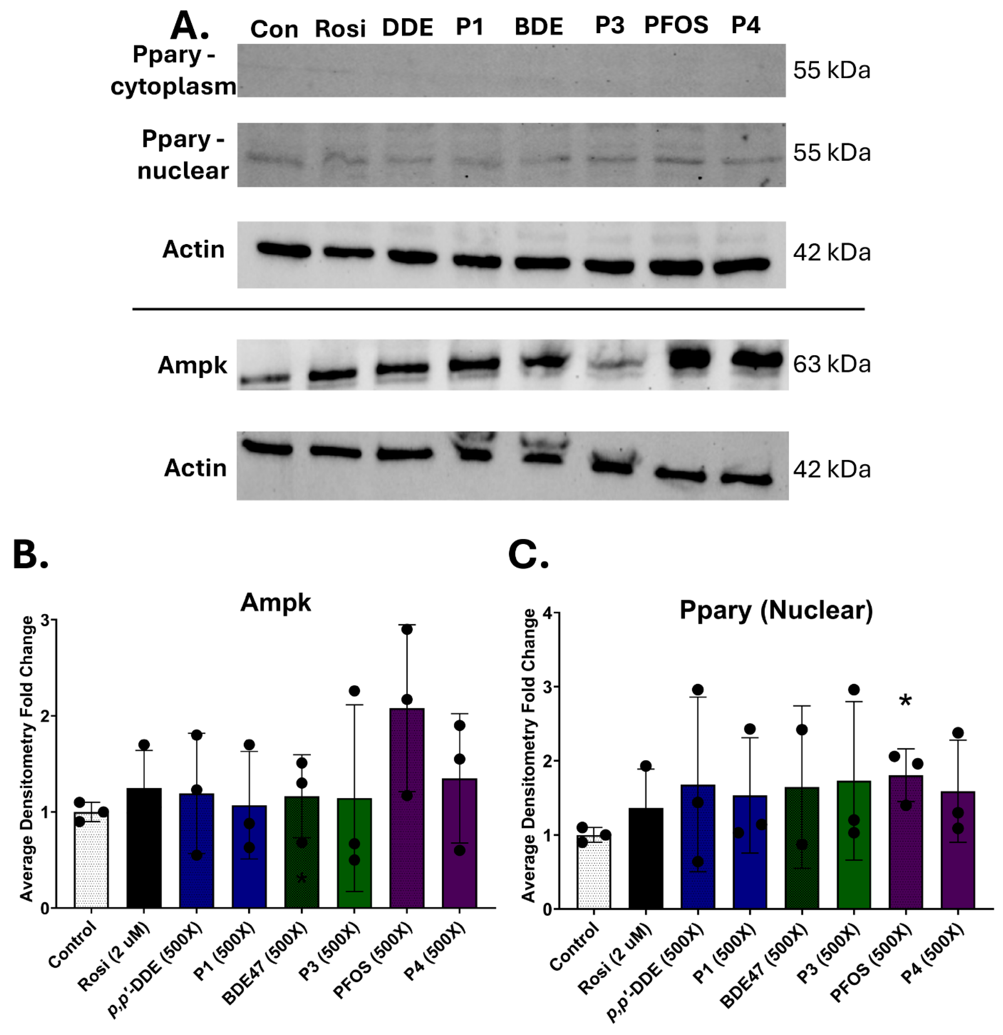Figure 7. Protein levels of Pparγ and Ampk. Profiles 1, 3, and 4, and their dominant chemicals (p,p′-DDE, BDE47, and PFOS) were (A) examined for changes in Pparγ or Ampk protein expression by immunoblotting. b-actin was used as a loading control. (B,C) Densitometry values of Pparγ and Ampk replicates (n = 3) were averaged and normalized to β-actin. The control samples were set to a relative value of 1 to calculate fold-change in expression for the exposure groups. Statistical differences (*) were determined by a one-way ANOVA followed by Tukey’s multiple comparisons test (p ≤ 0.05).