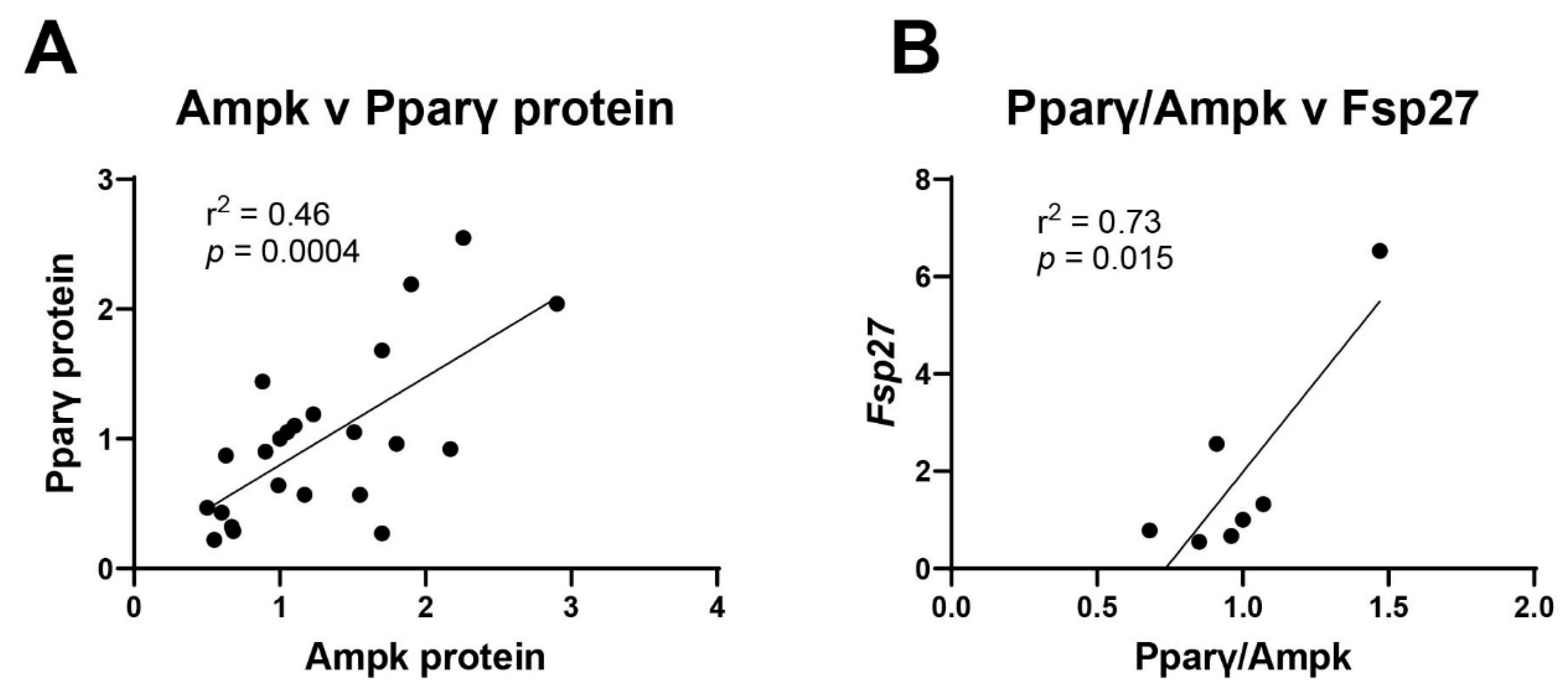Figure 8. Multiple transcription factors work in concert to alter adipogenesis. (A) Pparγ and Ampk protein expression values were plotted and their correlation determined by linear regression. (B) The ratio of Pparγ to Ampk was plotted against mRNA expression of Fsp27. Linear regression (GraphPad Prism) was used to determine signficant correlations (p ≤ 0.05).