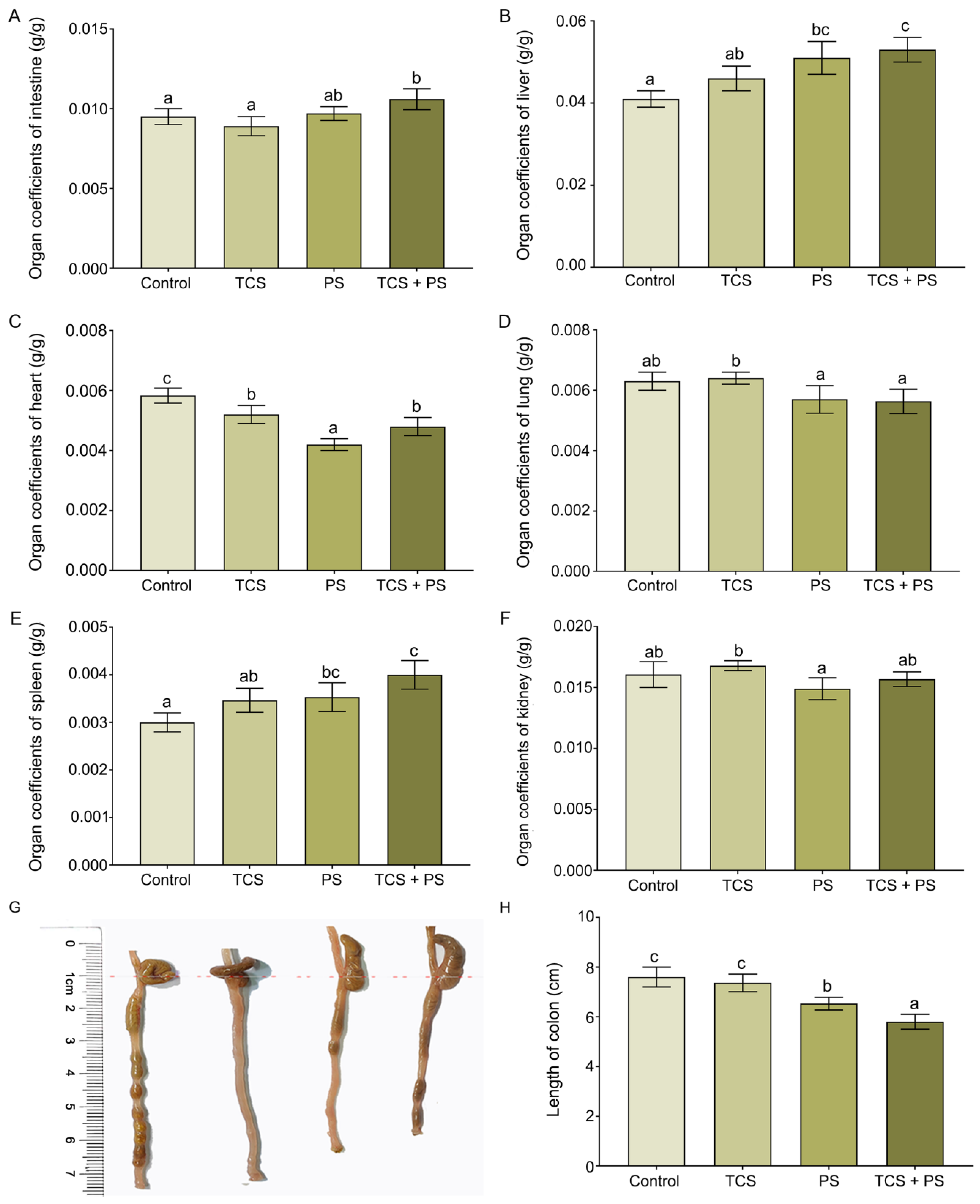 3.1. Changes in the Organ Coefficients of Mice Exposed to Polystyrene and Triclosan