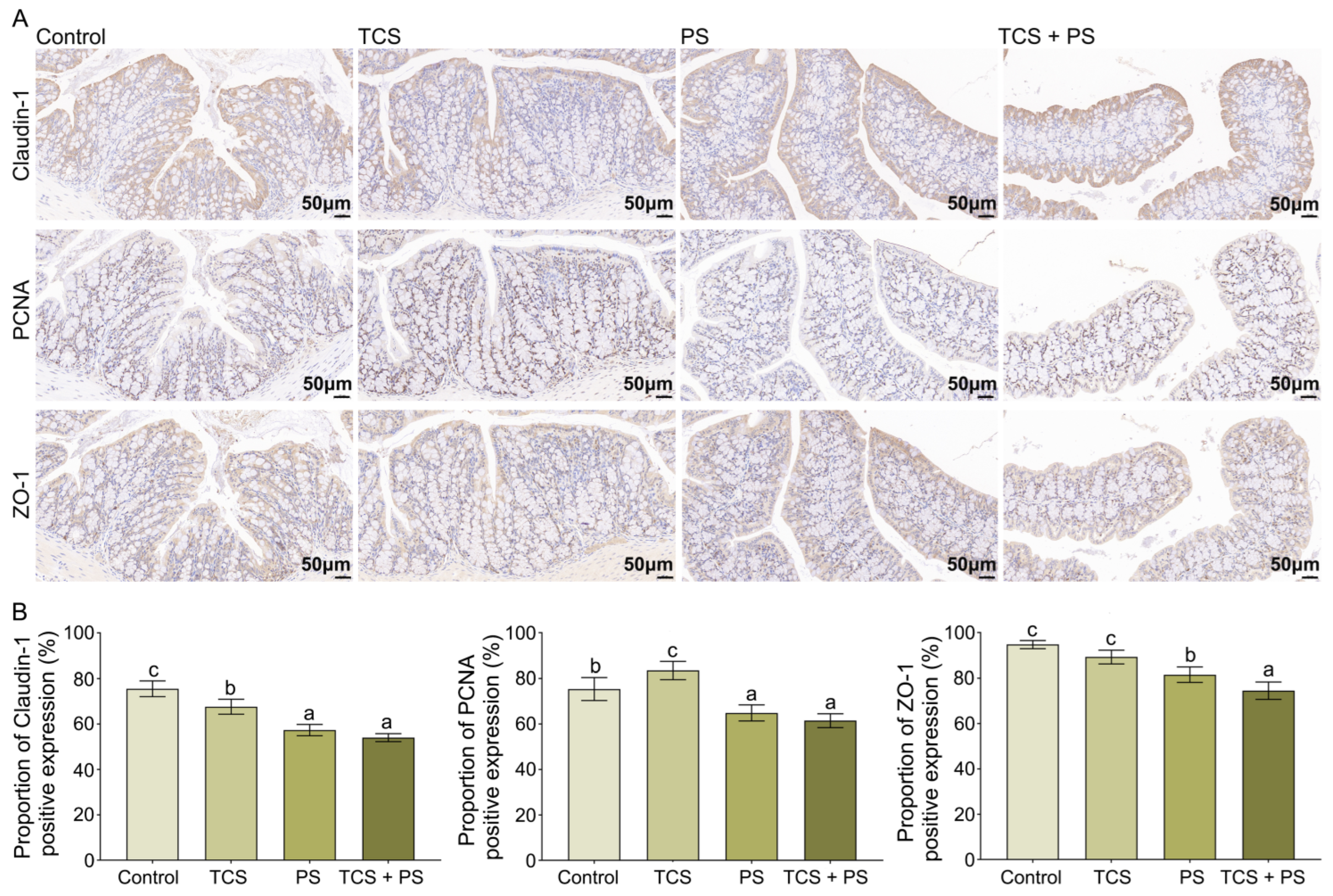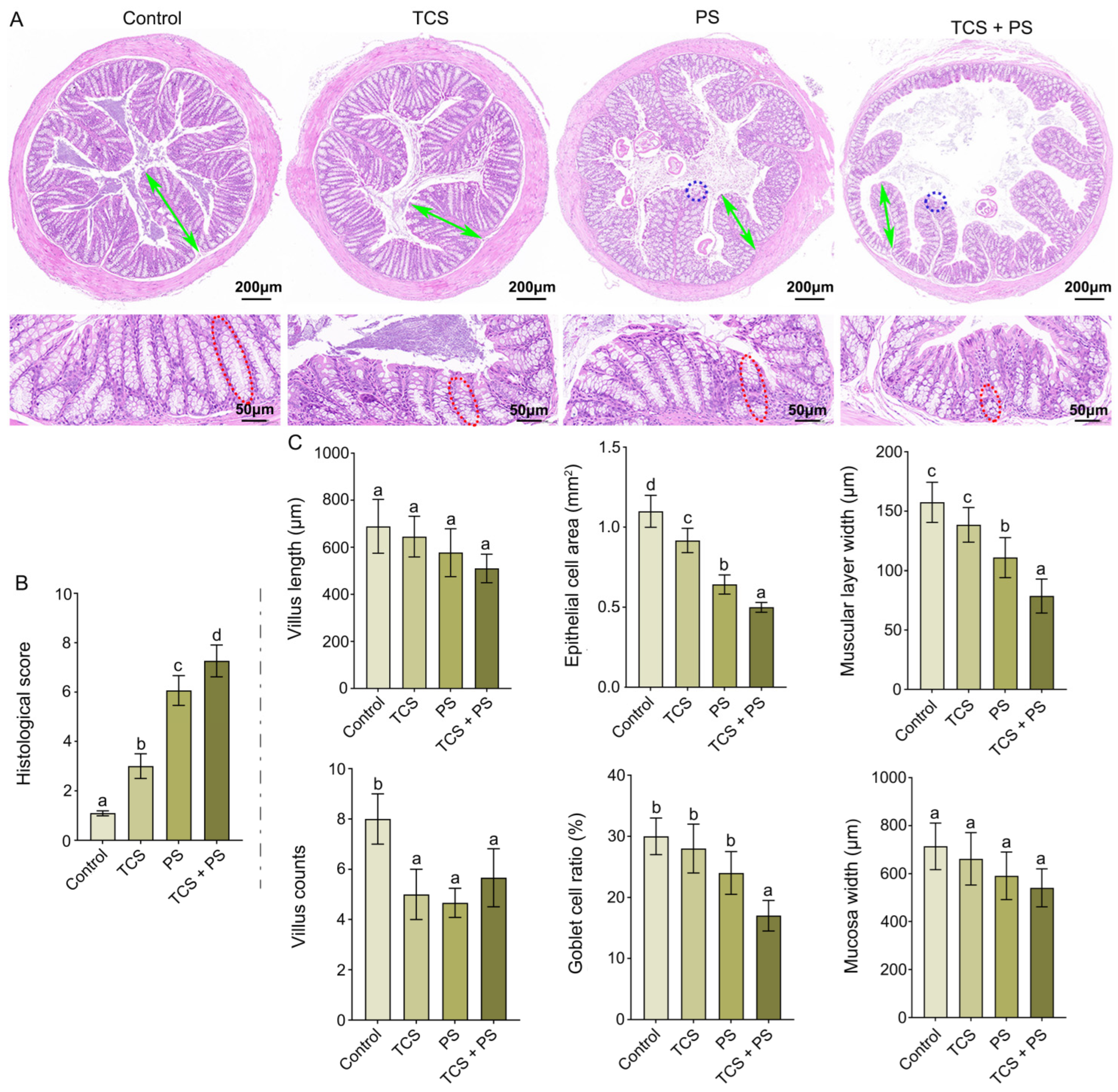 3.3. The Combined Effect of TCS and PS Aggravated Inflammation and Oxidative Stress in the Colon