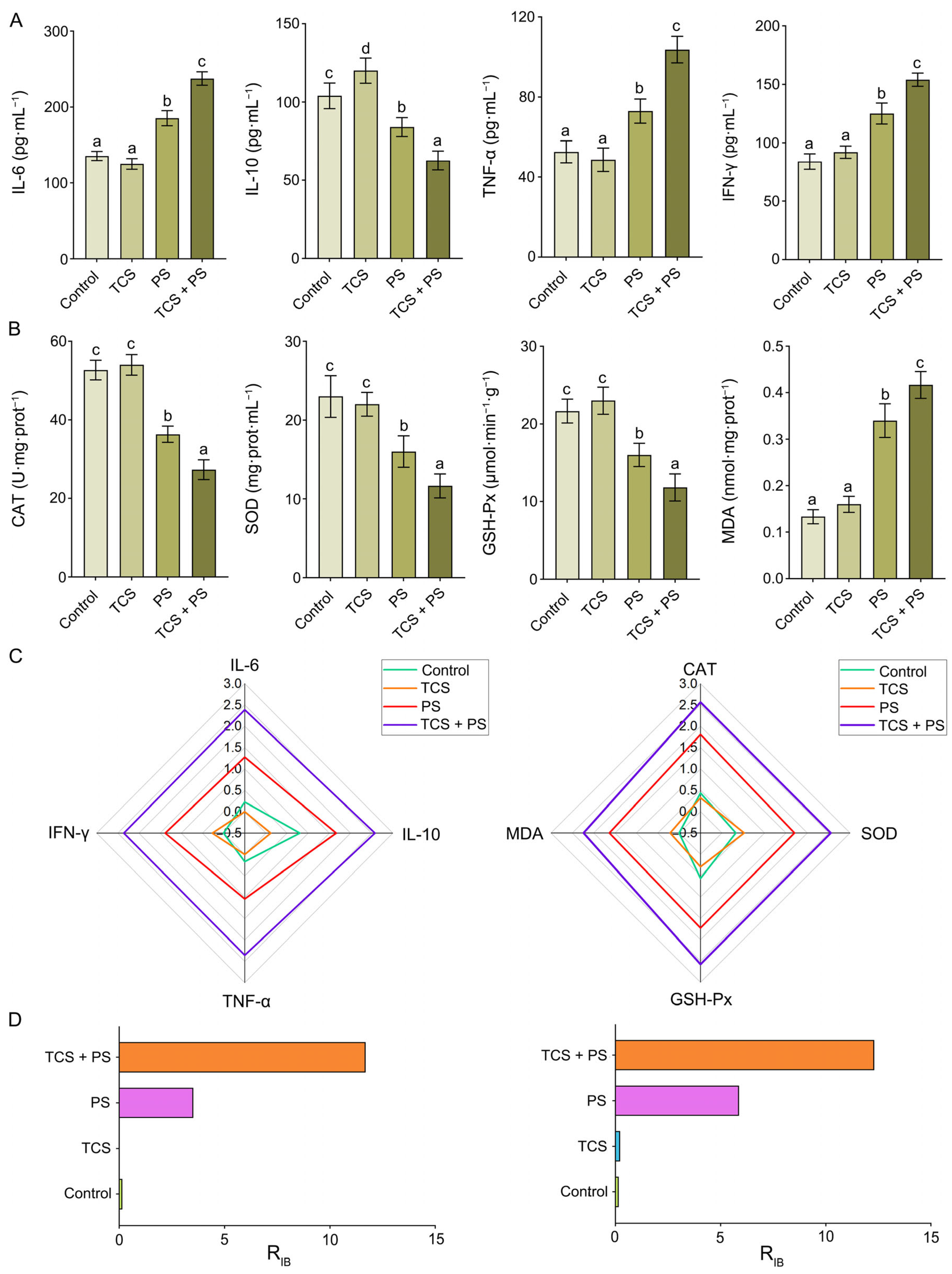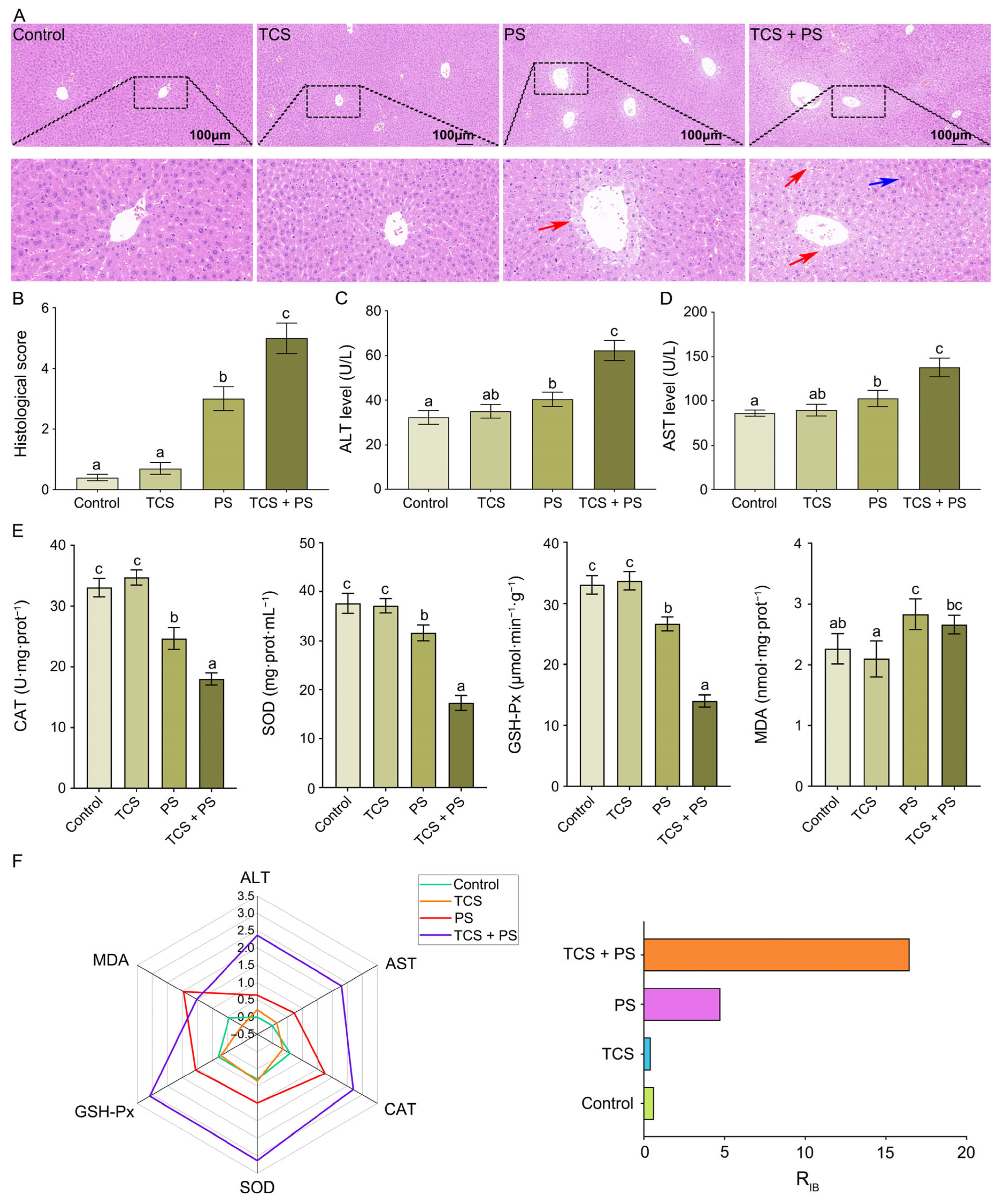3.4. The Combined Effect of TCS and PS Aggravated Tissue Damage and Oxidative Stress of Liver